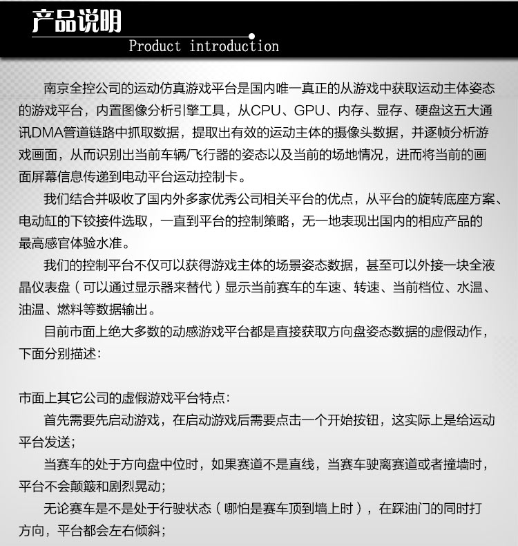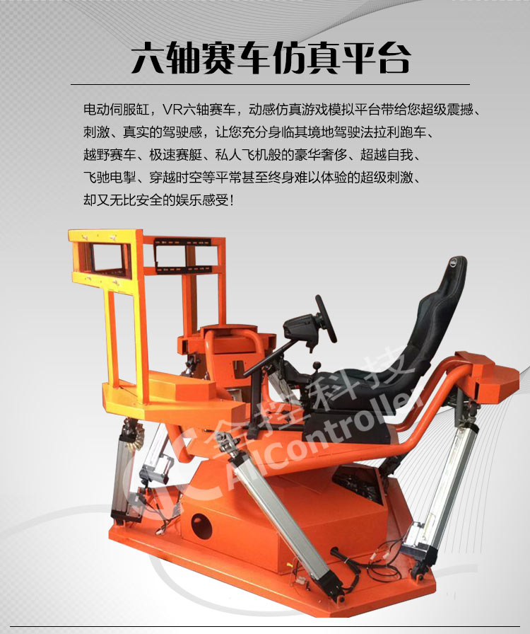 采用國(guó)際領(lǐng)先動(dòng)感控制技術(shù),使用電動(dòng)缸六自由度動(dòng)感平臺(tái),真正做到與游戲緊密結(jié)合,可以完成俯沖、爬升、傾斜、拐彎、旋轉(zhuǎn)、下墜、顛簸等高難度的驚險(xiǎn)刺激動(dòng)作,從動(dòng)感、駕駛操控、影音、仿真方面給予用戶超真實(shí)的體驗(yàn)。具有極高趣味性,新穎性,刺激性,震撼性,娛樂(lè)性,科普性, 可達(dá)到大量、快速吸引客戶眼球和超高級(jí)娛樂(lè)體驗(yàn)的效果。