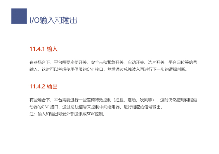 有些場合下,平臺需要座椅開關、安全帶和緊急開關、啟動開關、選片開關、平臺歸位等信號輸入,這時可以考慮使用伺服的CN1接口,然后通過總線讀入再進行下一步的邏輯判斷。