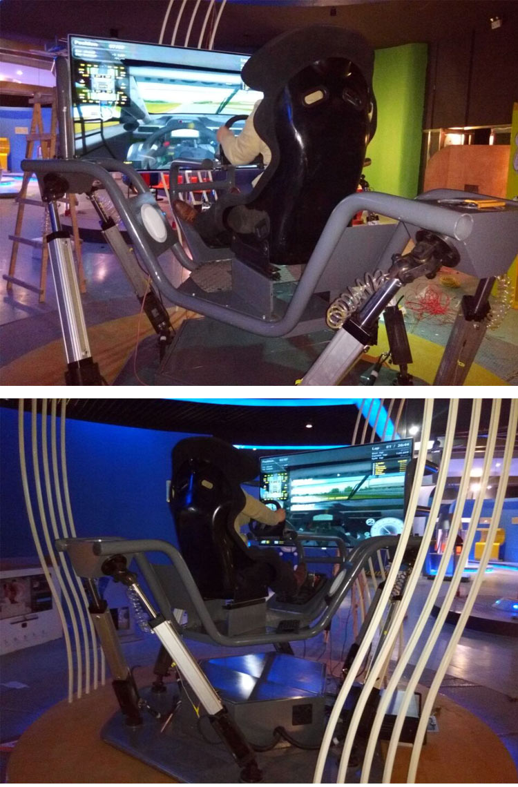 其中用到了三維圖像即時生成技術、汽車動力學仿真物理系統、大視場顯示技術(如多通道立體投影系統)、自由度運動平臺(或三自由度運動平臺)、用戶輸入硬件系統、立體聲音響、中控系統等。