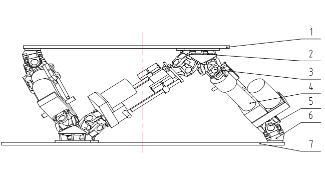 TecPlat平臺結(jié)構(gòu)示意圖如圖3.2.1,它由下臺基、上平臺及并聯(lián)連接兩者的6個電動缸組成,Mechanic電動缸與上、下平臺之間分別采用球鉸/虎克萬向鉸連接(圖3.2.2),6個電動缸可在缸軸向方向作線性移動,平臺正是通過6個電動缸的協(xié)調(diào)動作來實現(xiàn)6自由度的運動。整體框架如圖3.2.4所示。
